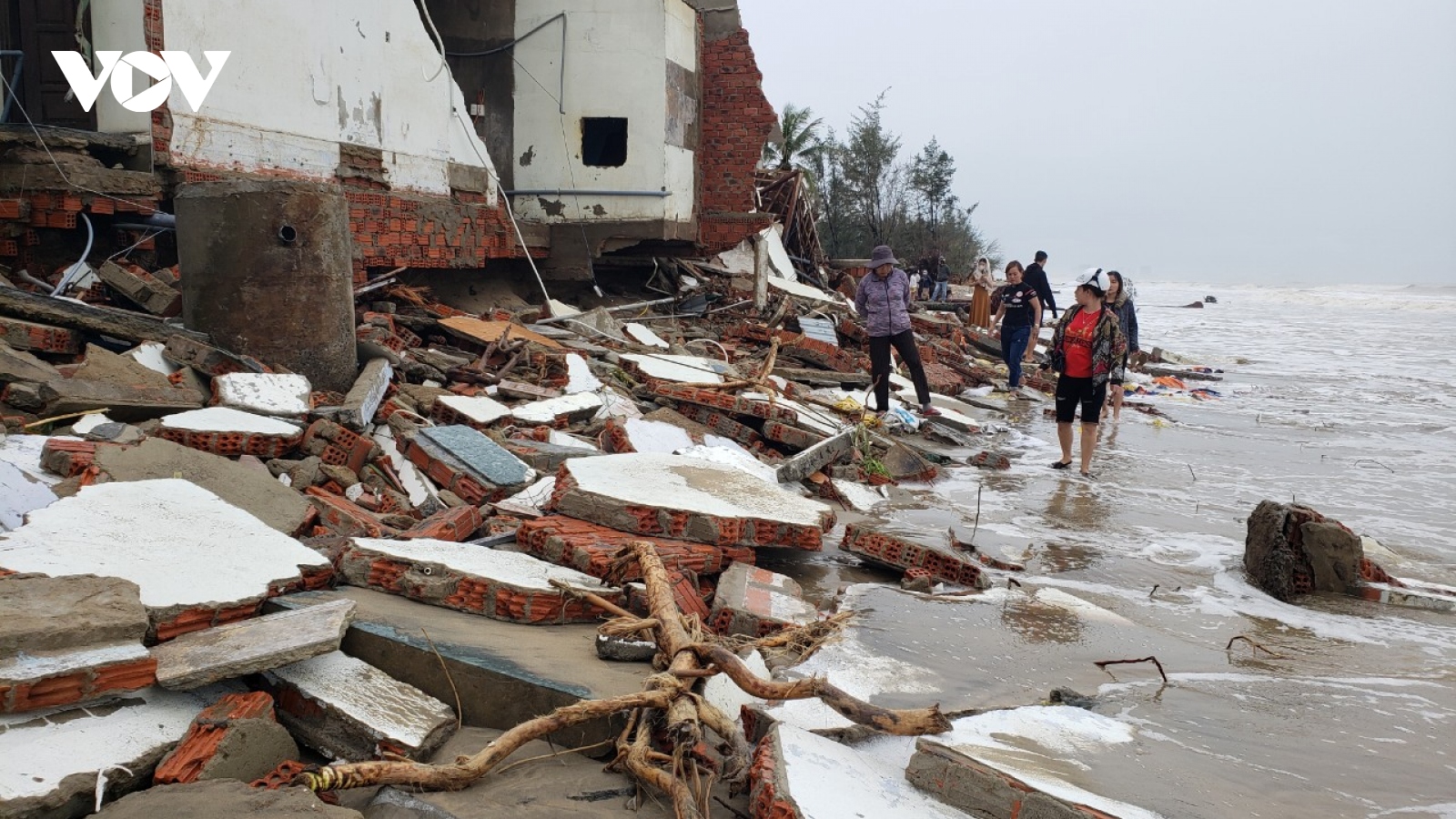 VOV.VN - Tại Quảng Nam, trong đêm 14/11, sóng lớn đã đánh sập nhiều km bờ biển phường Cửa Đại, Phường Cẩm An, thành phố Hội An. Nhiều hàng quán, nhà dân bị sạt lở cuốn ra biển.