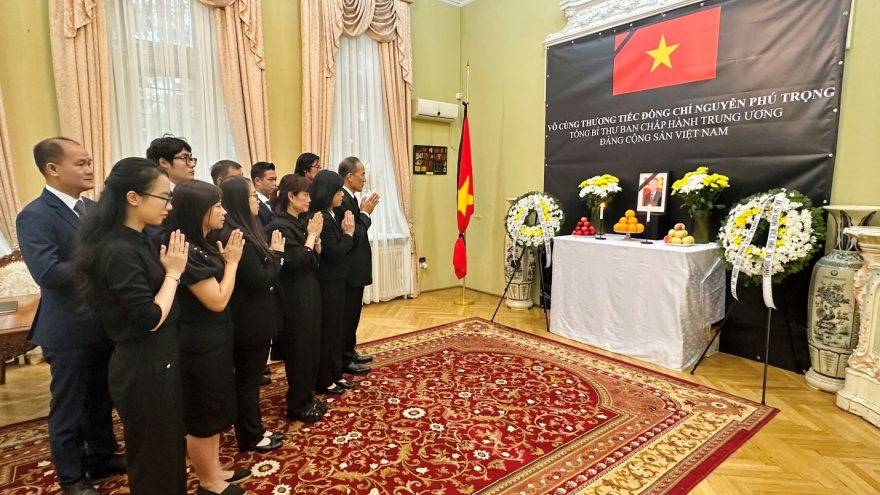 VOV.VN - Trong bầu không khí trang nghiêm và xúc động, cán bộ, nhân viên Đại sứ quán Việt Nam tại Romania và gia đình cùng đại diện cộng đồng người Việt Nam đã dành một phút mặc niệm để tướng nhớ và tiễn biệt Tổng Bí thư Nguyễn Phú Trọng.