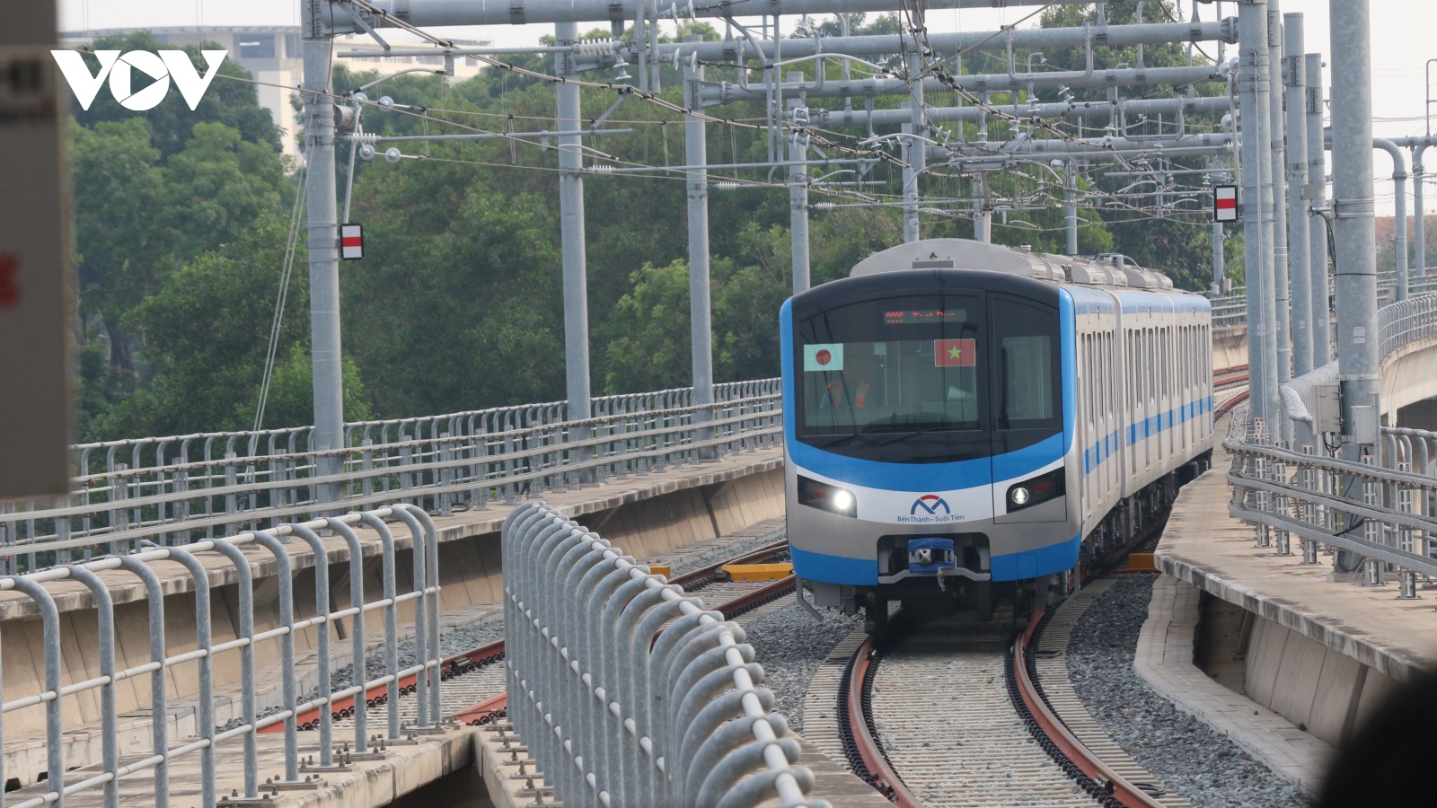 VOV.VN - Sáng nay (29/8), đoàn tàu đầu tiên của tuyến Metro số 1 (Bến Thành - Suối Tiên) bắt đầu chạy thử nghiệm trên toàn tuyến, bao gồm cả đoạn trên cao và đoạn đi ngầm, từ ga Bến xe Suối Tiên đến ga trung tâm Bến Thành.