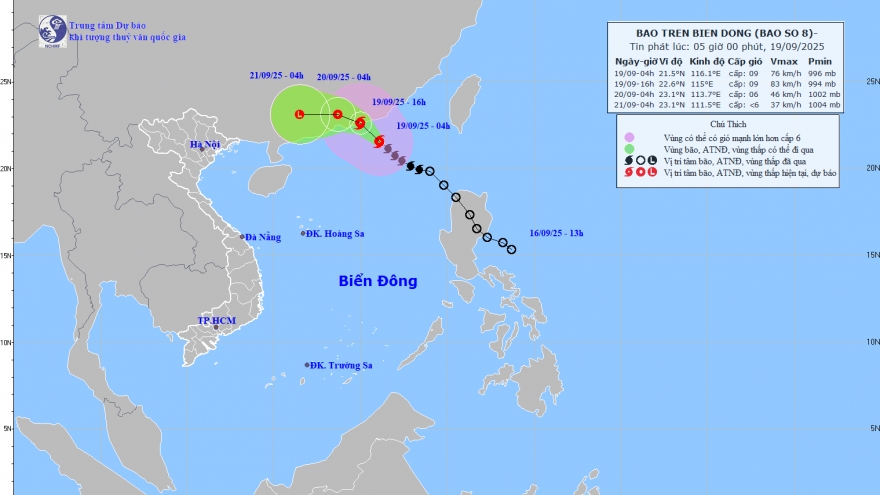 VOV.VN - Theo Trung tâm dự báo khí tượng thủy văn, hồi 13h ngày 19/9, tâm bão số 8 ở khoảng 22,6 độ Vĩ Bắc; 115,2 độ Kinh Đông, trên vùng ven biển tỉnh Quảng Đông (Trung Quốc), cách Hồng Kông khoảng 120km về phía Đông. Sức gió mạnh nhất cấp 9 (75-88 km/h), giật cấp 11.