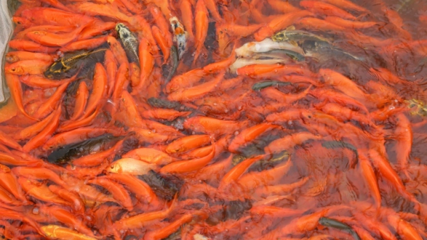 VOV.VN - Sát ngày cúng ông Công ông Táo (23 tháng Chạp), người dân làng nuôi cá chép đỏ Thủy Trầm, xã Tuy Lộc, huyện Cẩm (Phú Thọ) càng hối hả, bận rộn thu hoạch.