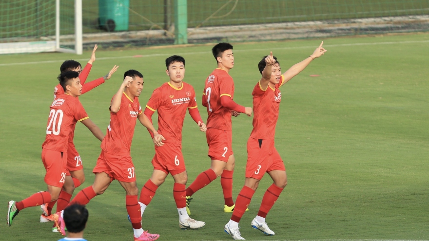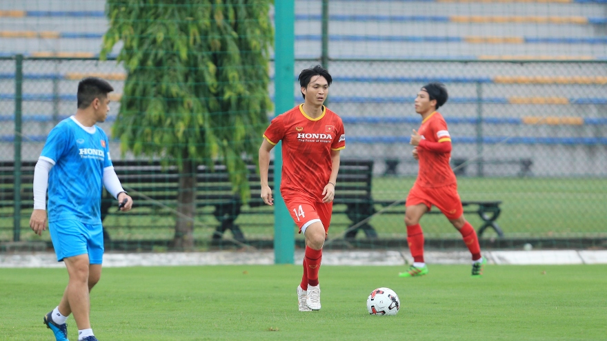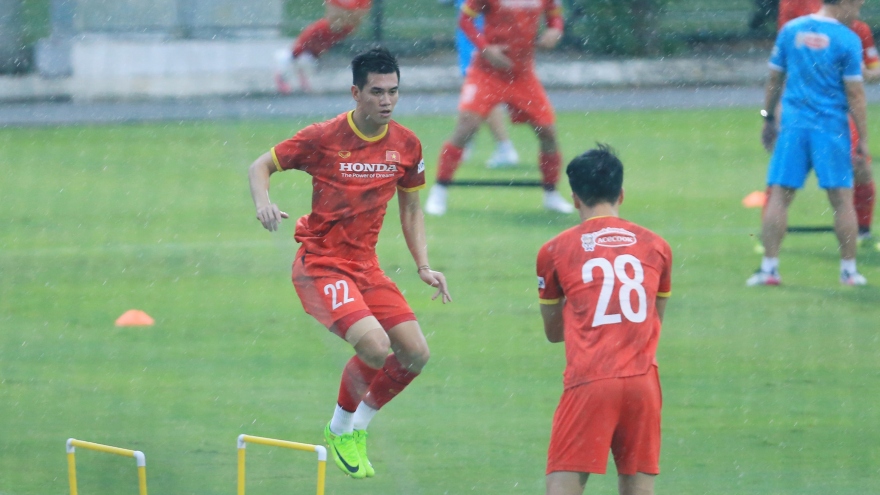 VOV.VN - Trong ngày hiếm hoi có thời tiết đẹp từ buổi đầu tập trung, ĐT Việt Nam đã tập luyện với tinh thần hứng khởi. Tiền đạo Tiến Linh cũng đã trở lại tập luyện cùng toàn đội.