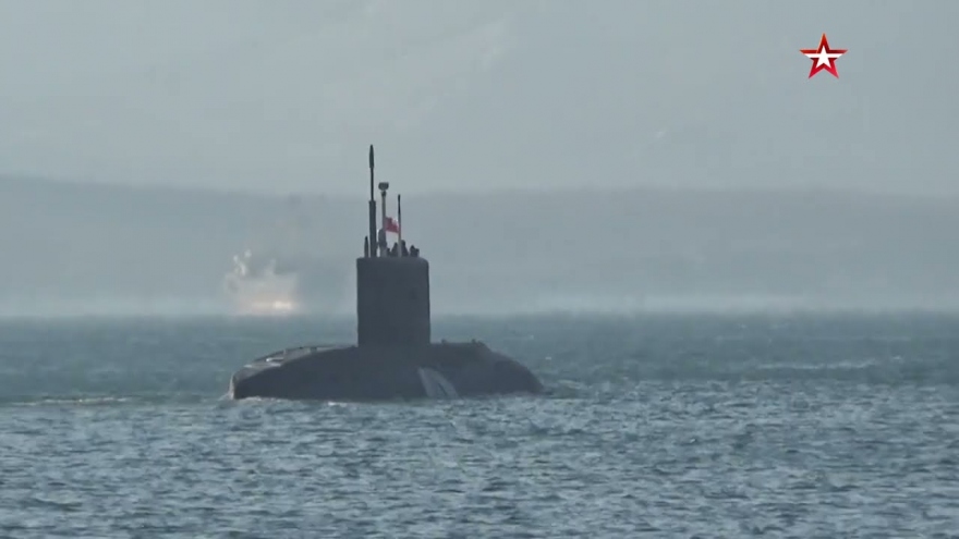 VOV.VN - Bộ Quốc phòng Nga mới đây đăng tải video cho thấy tàu ngầm chạy diesel-điện Volkhov thuộc hạm đội Thái Bình Dương phóng tên lửa hành trình Kalibr từ vị trí dưới nước. Tên lửa đánh trúng mục tiêu ven biển tại thao trường chiến thuật Surkum, Khabarovsk. Tên lửa có tầm bắn hơn 1.000 km.