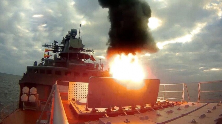 VOV.VN - Quân khu miền Nam của Nga cho biết, tàu hộ vệ tên lửa Veliky Ustyug đã phóng tên lửa hành trình Kalibr-NK, đánh trúng mục tiêu giả định trển bờ biển đảo Chechen, ở vùng biển Caspi, trong cuộc diễn tập chiến thuật định kỳ ngày 7/10.