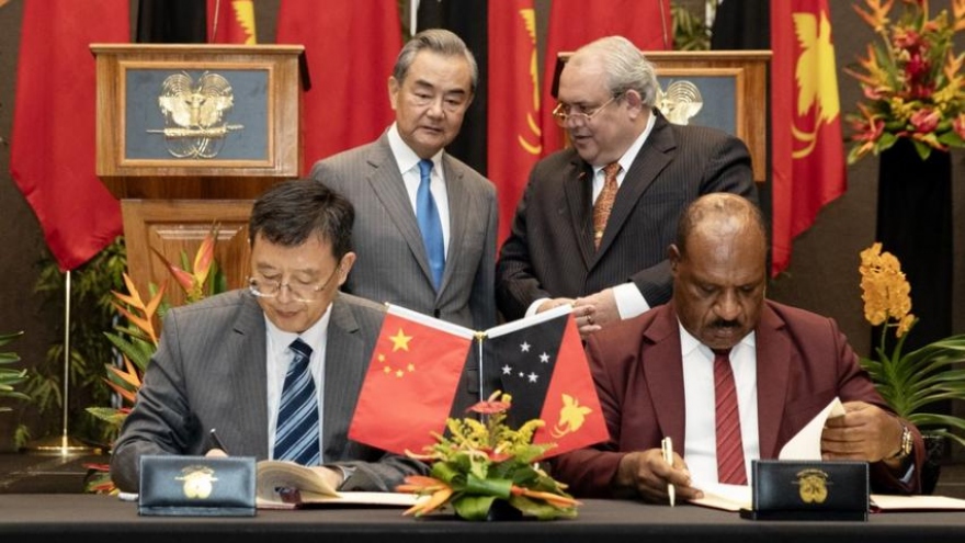 và Ngoại trưởng Papua New Guinea Justin Tkatchenko (đứng bên phải) chứng kiến lễ ký kết văn kiện hợp tác giữa hai nước. Nguồn Xinhua.jpg)