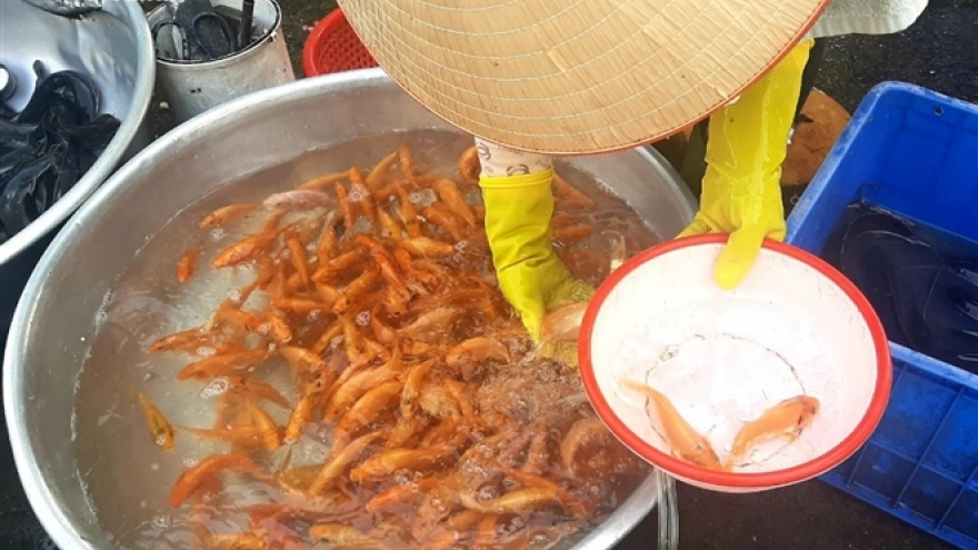 VOV.VN - Năm nay, thực phẩm cúng Tết ông Công, ông Táo có một số loại bánh lạ như: Bánh cá chép, bánh làm bằng đường tán có giá từ 30.000 - 50.000 đồng/cái màu sắc rất bắt mắt.