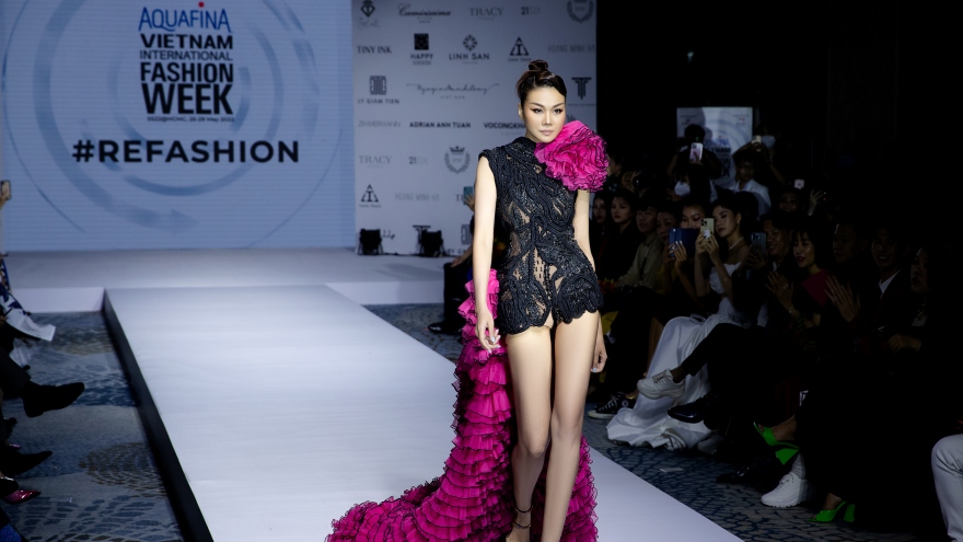 VOV.VN - Siêu mẫu Thanh Hằng chiếm sóng trên sàn runway trong buổi ra mắt Tuần lễ Thời trang Quốc tế Việt Nam lần thứ 13 với bộ trang phục của nhà thiết kế Tuyết Lê.