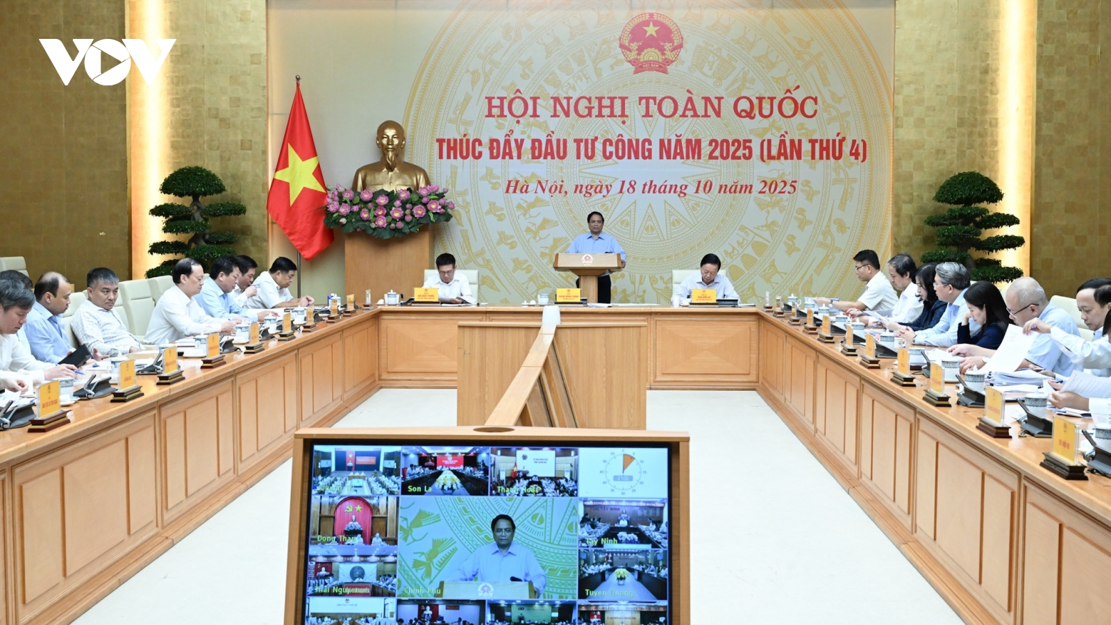 VOV.VN - Ngày 18/10, tại Trụ sở Chính phủ, Thủ tướng Phạm Minh Chính chủ trì Hội nghị toàn quốc lần thứ 4 về thúc đẩy đầu tư công năm 2025. Hội nghị được trực tuyến 34 tỉnh, thành phố trực thuộc Trung ương.