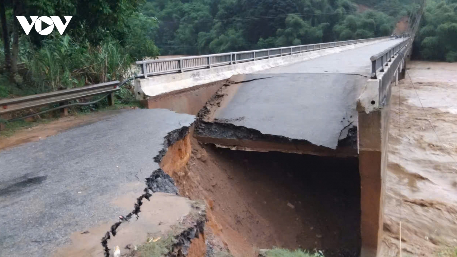 VOV.VN - Do ảnh hưởng từ cơn bão số 10, mưa lớn, lũ quét, nước các sông dâng cao cho nên cầu Sơn Thủy, xã Sơn Thủy, trên Quốc lộ 16 tại lý trình Km89+580 thuộc bản Chung Sơn đã bị hư hỏng nặng phần chân, mố cầu, và đặc biệt sập hoàn toàn mặt đường dẫn lên cầu.