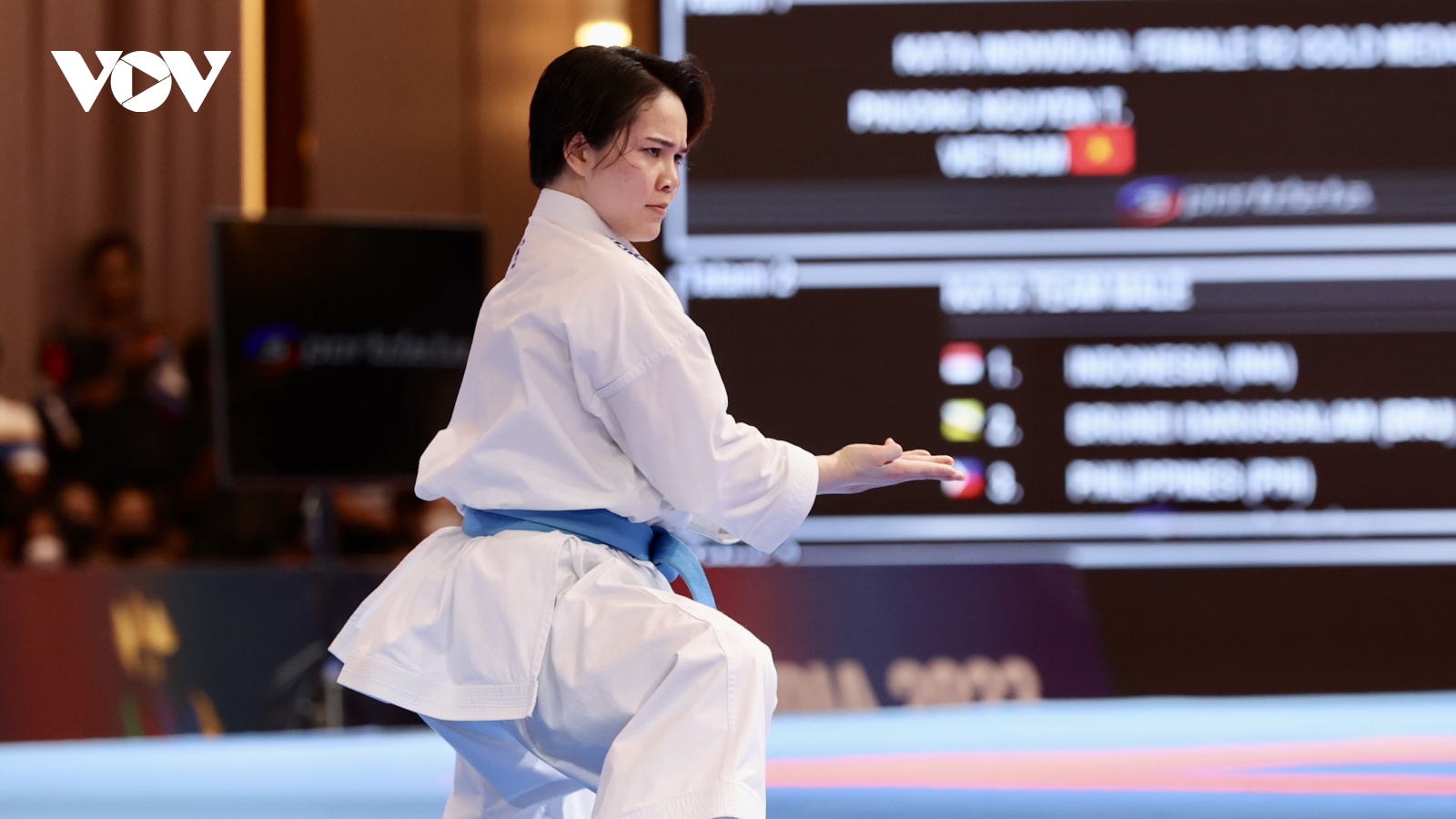VOV.VN - Võ sĩ Nguyễn Thị Phương gạt nỗi buồn thua trận chung kết nội dung Kata cá nhân nữ để giành HCV nội dung Kata đồng đội nữ với tư cách đội trưởng, qua đó "mở hàng vàng" cho Đoàn Thể thao Việt Nam ở SEA GAmes 32.