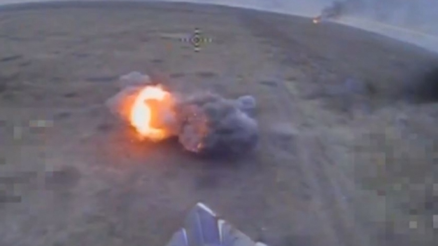 VOV.VN - Bộ Quốc phòng Nga ngày 27/11 công bố video cho thấy, một cặp máy bay cường kích Su-25 của nước này phóng tên lửa phá hủy các vị trí kiên cố và xe thiết giáp của lực lượng vũ trang Ukraine ở miền Đông.