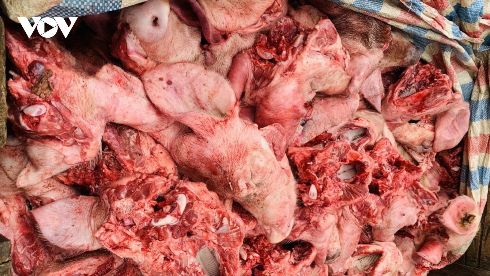 Phát hiện và tiêu hủy 350kg đầu lợn màu sắc tím tái, bốc mùi hôi thối