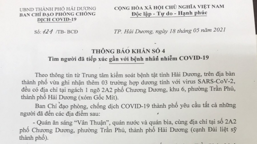 VOV.VN - Theo thông tin từ Trung tâm kiểm soát bệnh tật (CDC) tỉnh Hải Dương, trên địa bàn thành phố Hải Dương vừa ghi nhận thêm 3 trường hợp nghi mắc Covid-19.