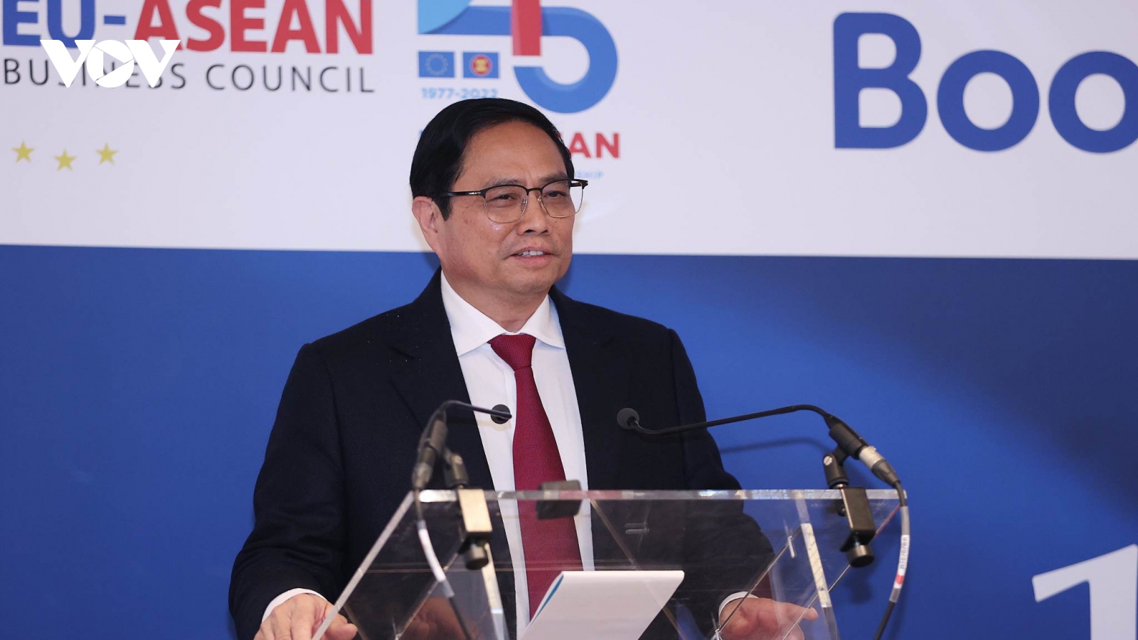 VOV.VN - Trưa 13/12, tại thủ đô Brussels, Vương quốc Bỉ, Thủ tướng Phạm Minh Chính đã dự và phát biểu tại Hội nghị Thượng đỉnh Kinh doanh ASEAN-EU bên lề Hội nghị Cấp cao Kỷ niệm 45 năm quan hệ ASEAN-EU với chủ đề: "Tăng cường thương mại ASEAN-EU: Phát triển bền vững cho tất cả mọi người".