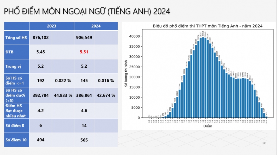 VOV.VN - Sáng nay (17/7), Bộ GD-ĐT vừa công bố điểm thi tốt nghiệp THPT 2024 và phổ điểm các tổ hợp dùng để xét tuyển đại học. Theo đó, tổ hợp A01 (Toán, Vật lý, Ngoại ngữ), mức điểm trung bình là 20,47, mức điểm trung vị là 20,75.