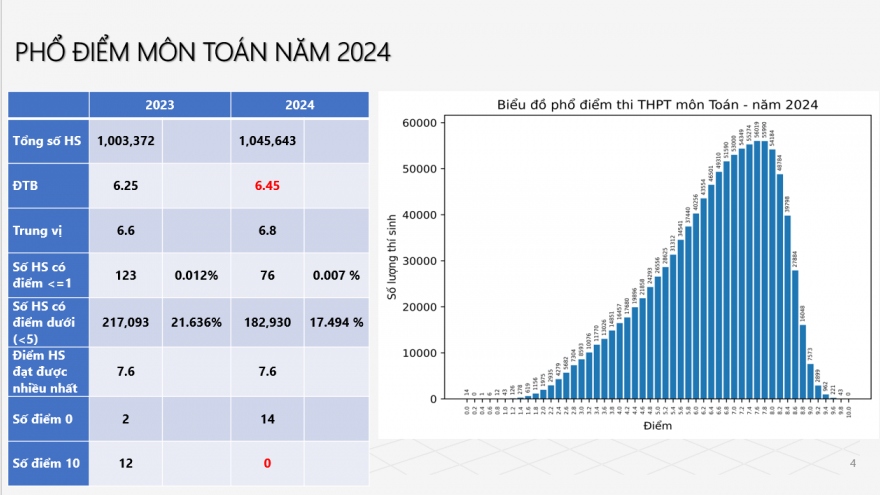 VOV.VN - Sáng nay (17/7), Bộ GD-ĐT công bố điểm thi tốt nghiệp THPT 2024. Với môn Toán, không có thí sinh nào đạt 10 điểm, mức điểm có nhiều thí sinh đạt được nhất là 7,6.