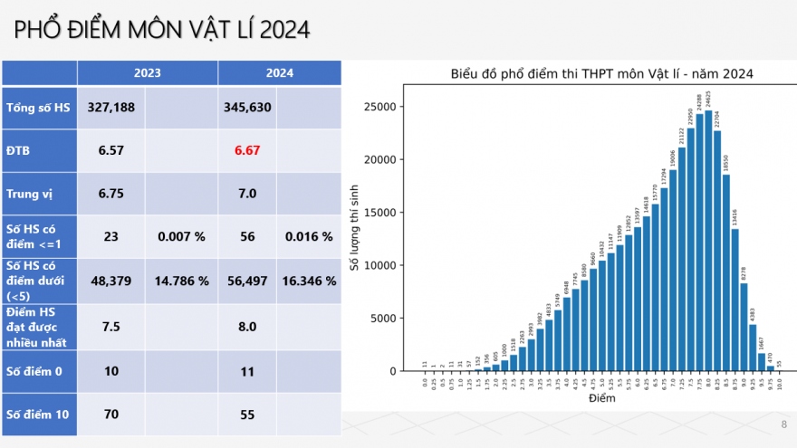 VOV.VN - Bộ GD- ĐT vừa công bố phổ điểm môn Vật lý - kỳ thi tốt nghiệp THPT 2024. Theo đó mức điểm trung bình là 6,67, số điểm có nhiều thí sinh đạt được nhất là 8,0.