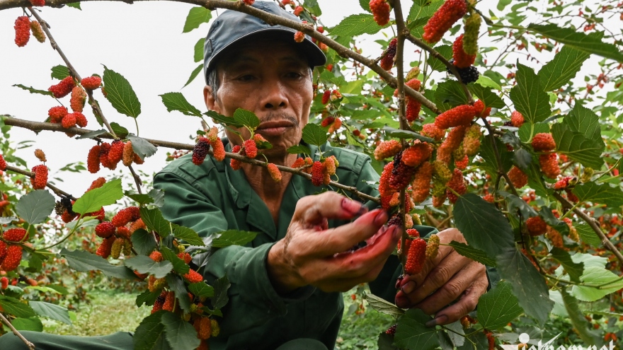 Người dân ở các nhà vườn thuộc hai xã Dương Liễu, Hiệp Thuận của huyện Hoài Đức, Phúc Thọ (Hà Nội) tất bật thu hoạch dâu bán khách, kiếm tiền triệu mỗi ngày.