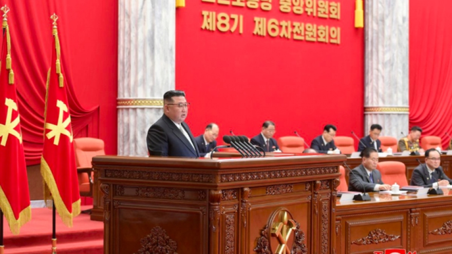 VOV.VN - Hãng thông tấn Trung ương Triều Tiên (KCNA) hôm nay (28/12) đưa tin, nhà lãnh đạo Kim Jong Un đã công bố các mục tiêu mới về quân sự của nước này trong năm 2023 tại Hội nghị toàn thể mở rộng lần thứ 6 của Ban chấp hành Trung ương Đảng Lao động Triều Tiên khóa 8.