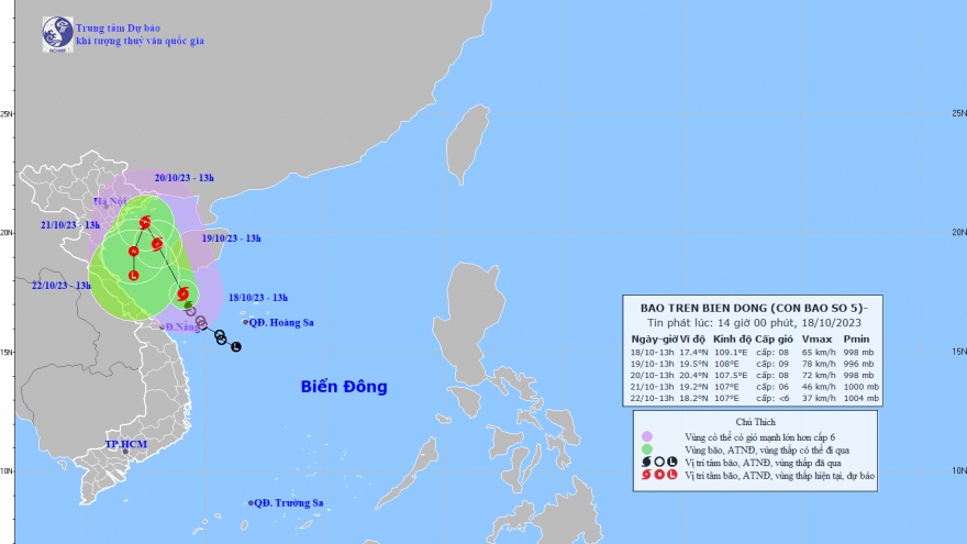VOV.VN - Vị trí tâm bão ở vào khoảng 17,4 độ Vĩ Bắc; 109,1 độ Kinh Đông, trên vùng biển phía Nam đảo Hải Nam (Trung Quốc), cách đất liền khu vực Quảng Trị-Thừa Thiên Huế khoảng 200km về phía Đông Đông Bắc.