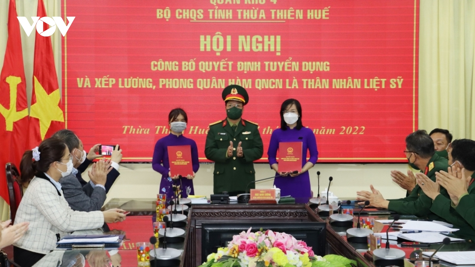 VOV.VN - Sáng 27/1, Đảng ủy, Bộ Chỉ huy Quân sự tỉnh Thừa Thiên Huế tổ chức công bố Quyết định tuyển dụng và trao quân hàm quân nhân chuyên nghiệp cho vợ và con liệt sĩ hy sinh trong khi làm nhiệm vụ cứu hộ, cứu nạn tại Thủy điện Rào Trăng 3.