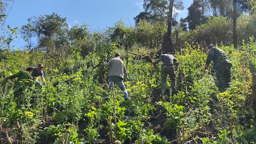 VOV.VN - Tổ công tác liên ngành đã tiến hành kiểm đếm có 450 cây thuốc phiện và lập biên bản phá nhổ, tịch thu số cây thuốc phiện trên để tiêu hủy bằng biện pháp tẩm xăng, đốt cháy.