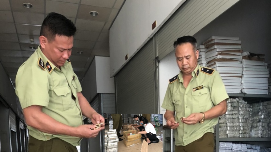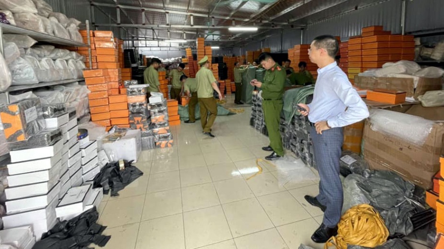 VOV.VN - Cục quản lý thị trường tỉnh Quảng Ninh kiểm tra Trung tâm thương mại Móng Cái Plaza (TP Móng Cái), phát hiện hơn 5.000 sản phẩm nhập lậu, giả thương hiệu nổi tiếng.