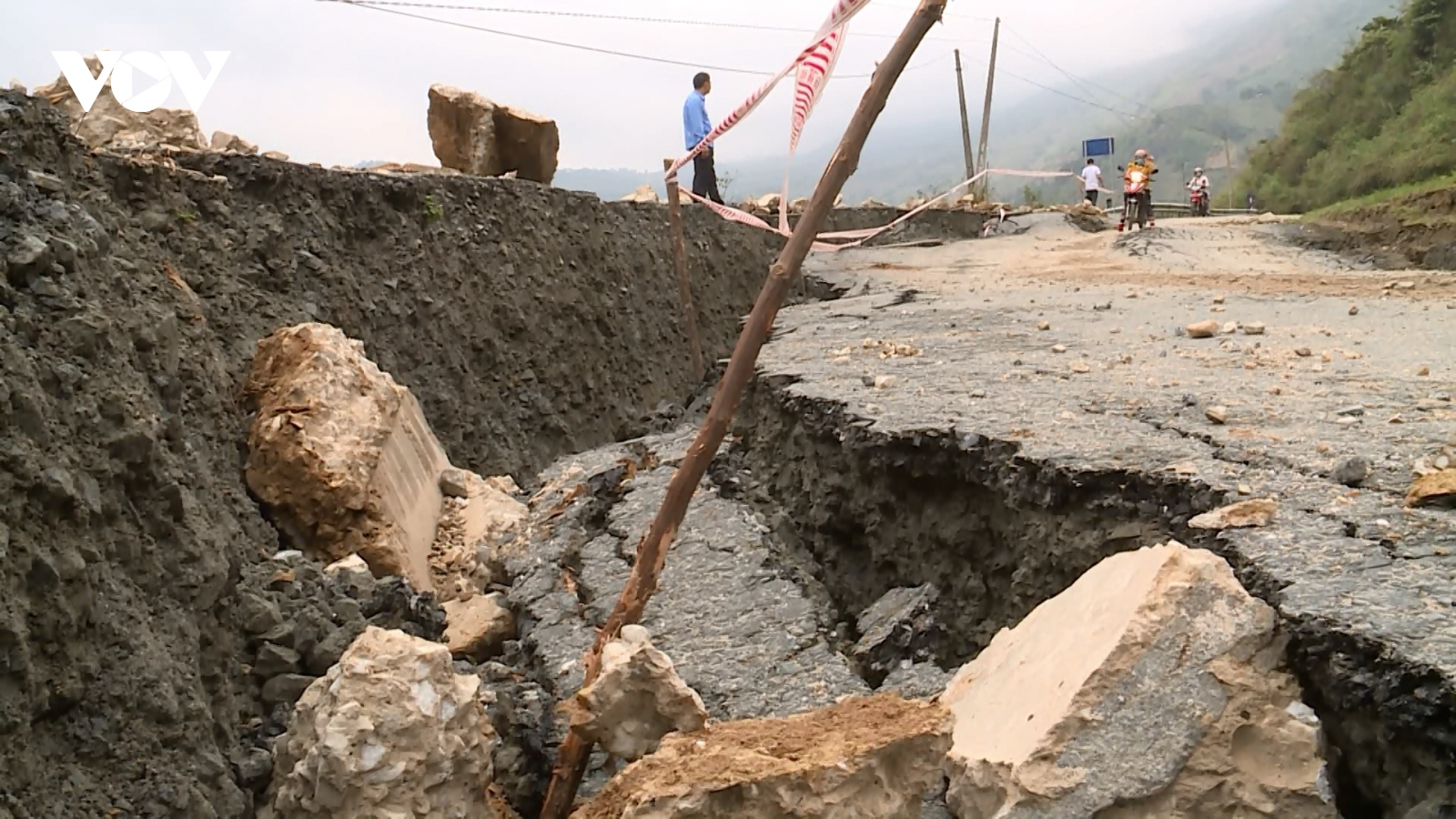 VOV.VN - Tình hình trở nên nghiêm trọng khi mặt đường đứt gãy nặng nề, sụt lún sâu hàng mét, khiến cơ quan chức năng phải tạm dừng khẩn cấp không cho xe ô tô qua lại.