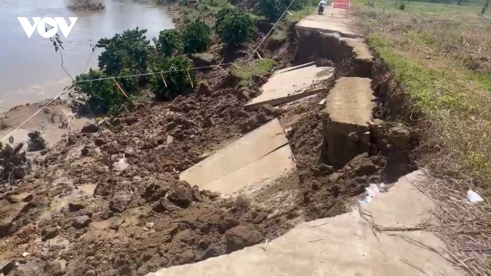 VOV.VN - Tình trạng sạt lở bờ sông Krông Nô (tỉnh Đắk Nông) vẫn đang diễn ra nghiêm trọng trong thời gian qua. Chiều 24/10, khoảng 30m đường bê tông đầu tư xây dựng năm 2020 ở thôn Nam Ninh, xã Nâm N'đir, đã bị cuốn trôi xuống sông Krông Nô.