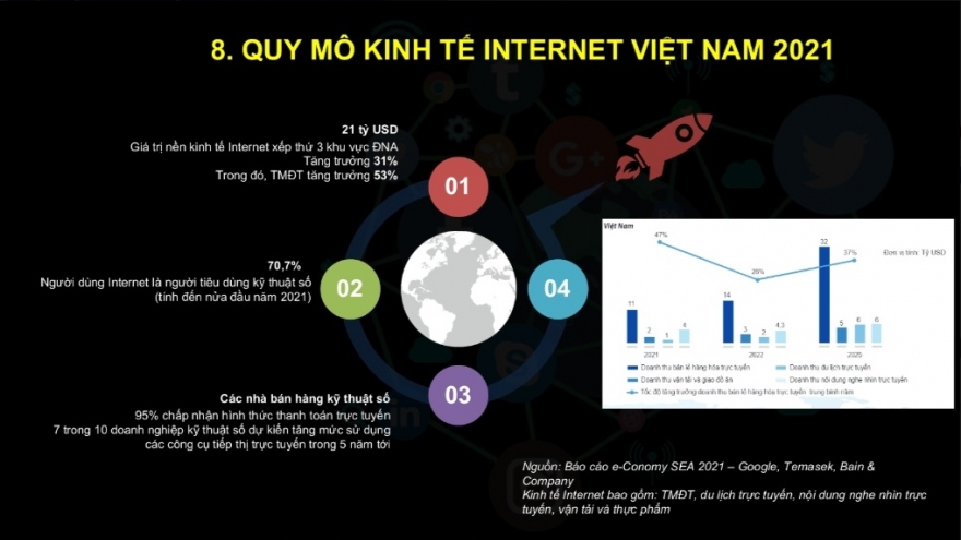 VOV.VN - Theo các chuyên gia, 72 triệu người Việt Nam đang sử dụng Internet. Bình quân mỗi năm, mỗi người đang dùng 288 USD mua sắm trực tuyến. Việt Nam đang có tiềm năng rất lớn để phát triển kinh tế số, nhưng song song với đó là nhiều thách thức cần được nhận diện, giải quyết sớm. Hay có thể hiểu thông thường, kinh tế số hiện đang được nhìn nhận chủ yếu ở hoạt động thương mại điện tử.