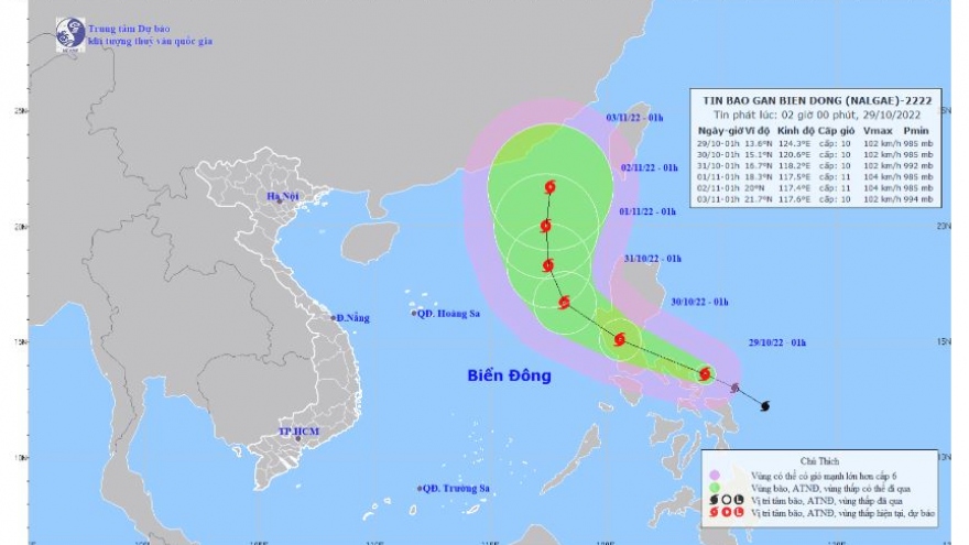 VOV.VN - Theo Trung tâm Dự báo khí tượng thủy văn Quốc gia, vào 01 giờ ngày 29/10, vị trí tâm bão Nalgae ở vào khoảng 13,6 độ Vĩ Bắc; 124,3 độ Kinh Đông, trên vùng biển phía Đông miền Trung Philippines.