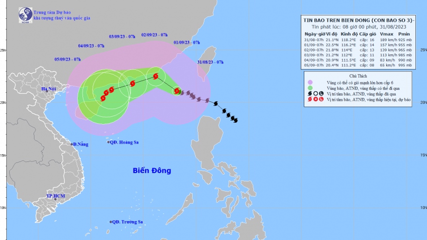 VOV.VN - Theo Trung tâm Dự báo Khí tượng thủy văn quốc gia, đến 7h ngày 31/8, bão số 3 tiếp tục di chuyển trên vùng biển phía Đông Bắc của khu vực Bắc Biển Đông, cách Hồng Kông (Trung Quốc) khoảng 470km về phía Đông Nam.
