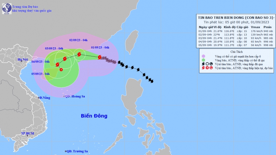 VOV.VN - Thông tin bão số 3 mới nhất ngày 1/9, sức gió mạnh nhất vùng gần tâm bão mạnh cấp 15 (167-183km/h), giật trên cấp 17, di chuyển theo hướng Tây Tây Bắc, tốc độ khoảng 10 km/h.
