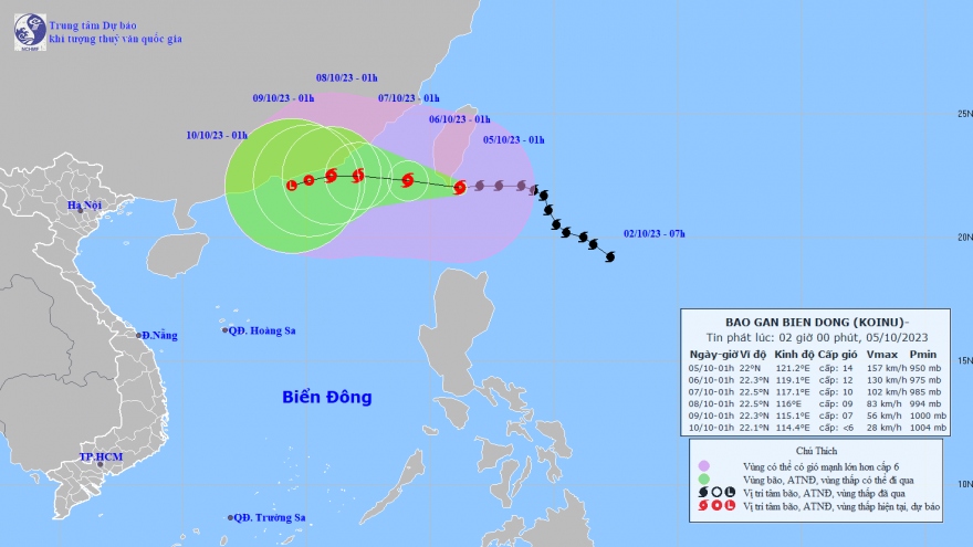 VOV.VN - Theo Trung tâm Dự báo Khí tượng thủy văn Quốc gia, sức gió mạnh nhất vùng gần tâm bão Koinu mạnh cấp 14 (150-166km/h), giật cấp 17, di chuyển theo hướng Tây Bắc, khoảng 10km/h.