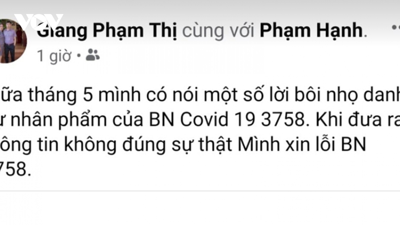 VOV.VN - Chia sẻ những thông tin không đúng sự thật, xúc phạm danh dự, nhân phẩm của bệnh nhân mắc Covid-19 trong đợt bùng phát dịch thứ 4 tại tỉnh Điện Biên, chủ sở hữu tài khoản Facebook có tên “Giang Phạm Thị” đã phải xin lỗi công khai người bị xúc phạm trên mạng xã hội.