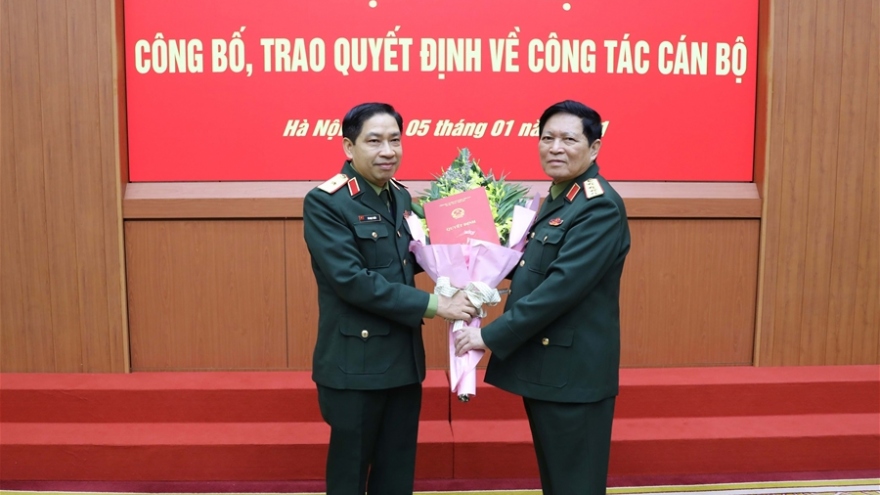 Đại tướng Ngô Xuân Lịch, Ủy viên Bộ Chính trị, Phó Bí thư Quân ủy Trung ương, Bộ trưởng Bộ Quốc phòng, vừa trao Quyết định thăng quân hàm Thiếu tướng cho Trưởng ban Ban Cơ yếu Chính phủ Vũ Ngọc Thiềm.