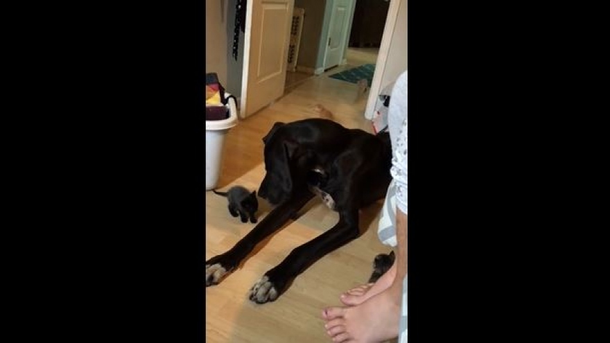 VOV.VN - Thay vì cau có hay nổi giận với những chú mèo con tò mỏ xung quanh, chú chó này dường như rất thoải mái và dịu dàng khi chơi đùa với những người bạn bé nhỏ.