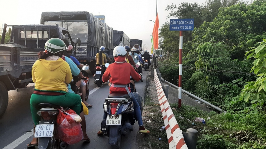 VOV.VN - Chiều nay (29/4), tình hình giao thông tại cửa ngõ Miền Tây thuộc địa bàn tỉnh Tiền Giang và Bến Tre diễn biến phức tạp. Đặc biệt tại gần cầu Rạch Miễu, quốc lộ 60, quốc lộ 1 xảy ra nhiều điểm ùn ứ giao thông.