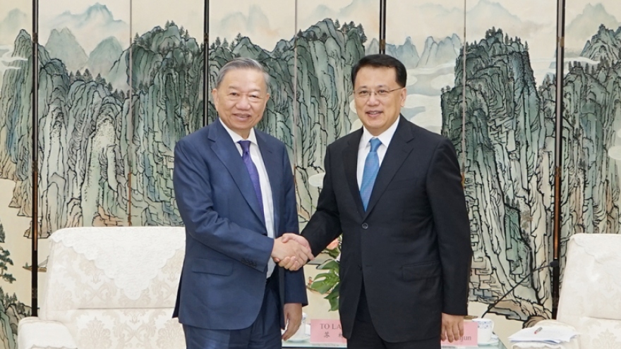 VOV.VN - Tiếp tục các hoạt động trong khuôn khổ chuyến thăm chính thức Trung Quốc, hôm nay, Đoàn đại biểu cấp cao Bộ Công an Việt Nam do Đại tướng Tô Lâm, Ủy viên Bộ Chính trị, Bộ trưởng dẫn đầu đã hội kiến với đồng chí Viên Gia Quân, Ủy viên Bộ Chính trị, Bí thư Thành ủy thành phố Trùng Khánh, Trung Quốc.