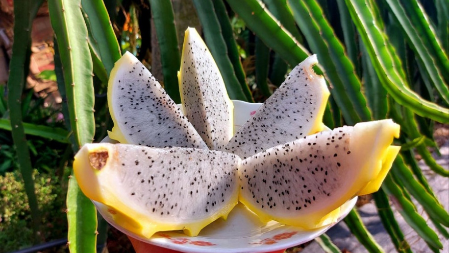 VOV.VN - Thanh long vỏ vàng - ruột rắng được thu mua với giá hơn 100.000 đồng/kg nhưng trái thanh long vỏ vàng có gai còn gọi là thanh long tổ yến có giá đến trên 400.000 đồng/kg.