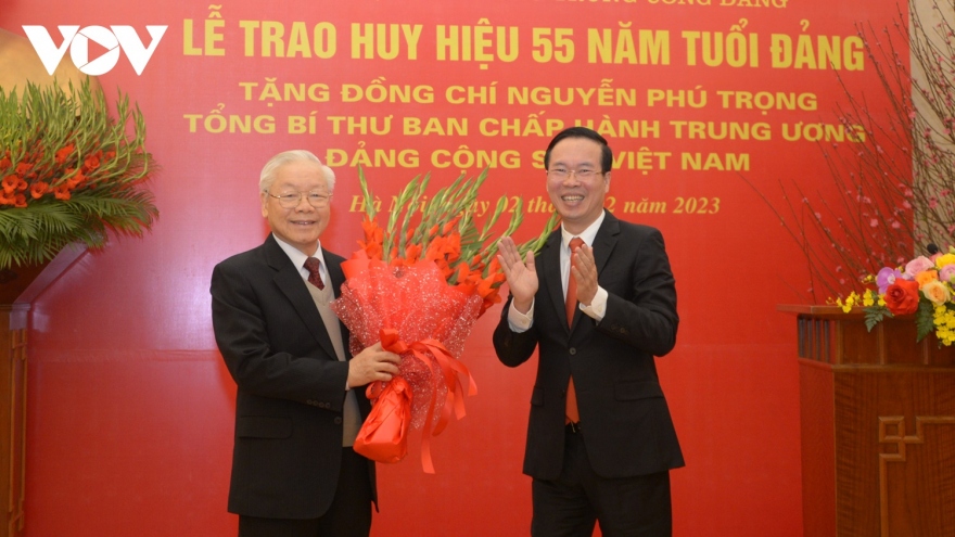VOV.VN - Phát biểu tại Lễ trao Huy hiệu 55 năm tuổi Đảng tặng Tổng Bí thư Nguyễn Phú Trọng, Thường trực Ban Bí thư Võ Văn Thưởng nhấn mạnh: 55 năm đứng trong hàng ngũ của Đảng, đồng chí Nguyễn Phú Trọng luôn tuyệt đối trung thành với Đảng, với Tổ quốc và Nhân dân; trong mọi hoàn cảnh luôn tỏ rõ bản lĩnh, trí tuệ của người cộng sản kiên cường.
