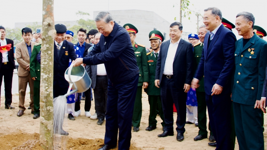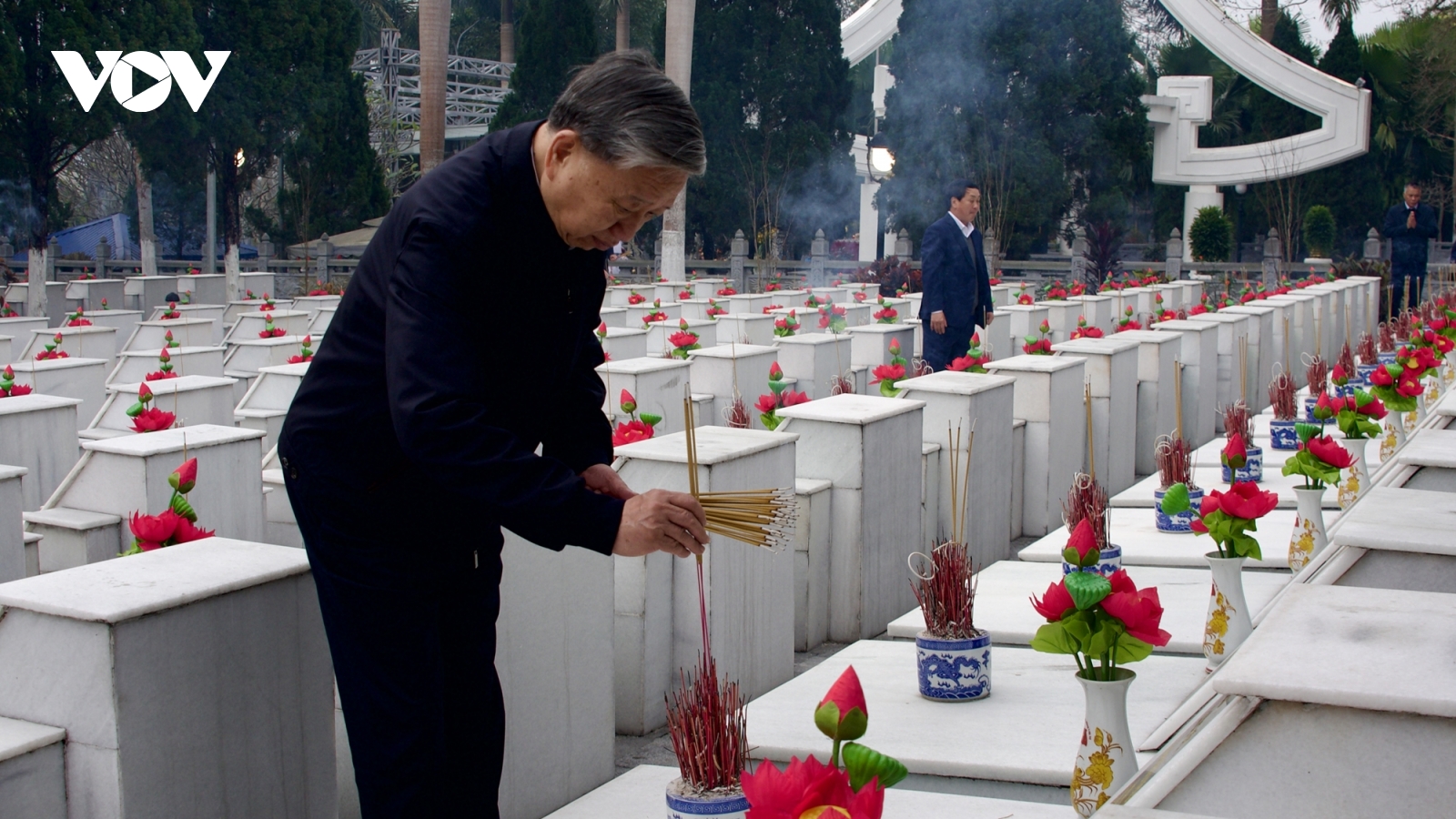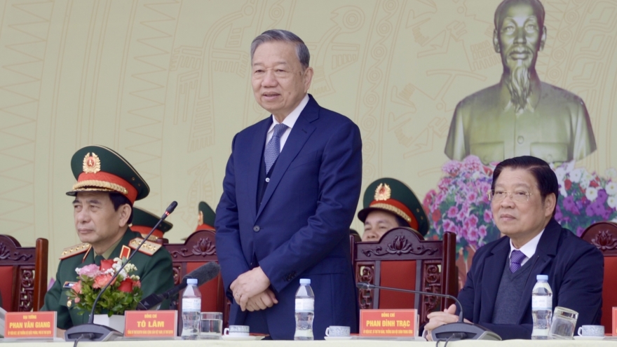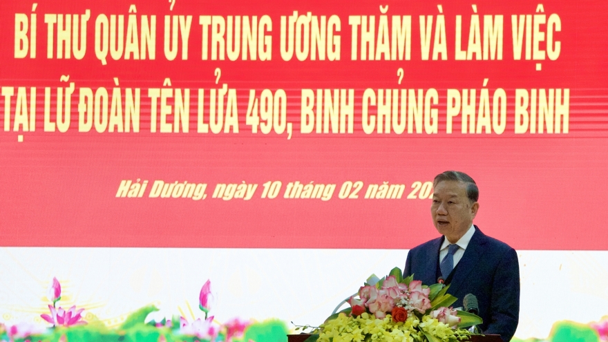 VOV.VN - Ngày 10/2, tại Hải Dương, nhân dịp đầu xuân năm mới Ất Tỵ 2025, Tổng Bí thư Tô Lâm, Bí thư Quân uỷ Trung ương dẫn đầu đoàn công tác Trung ương về thăm và làm việc với Lữ đoàn tên lửa 490, Binh chủng Pháo binh, Bộ Quốc phòng.