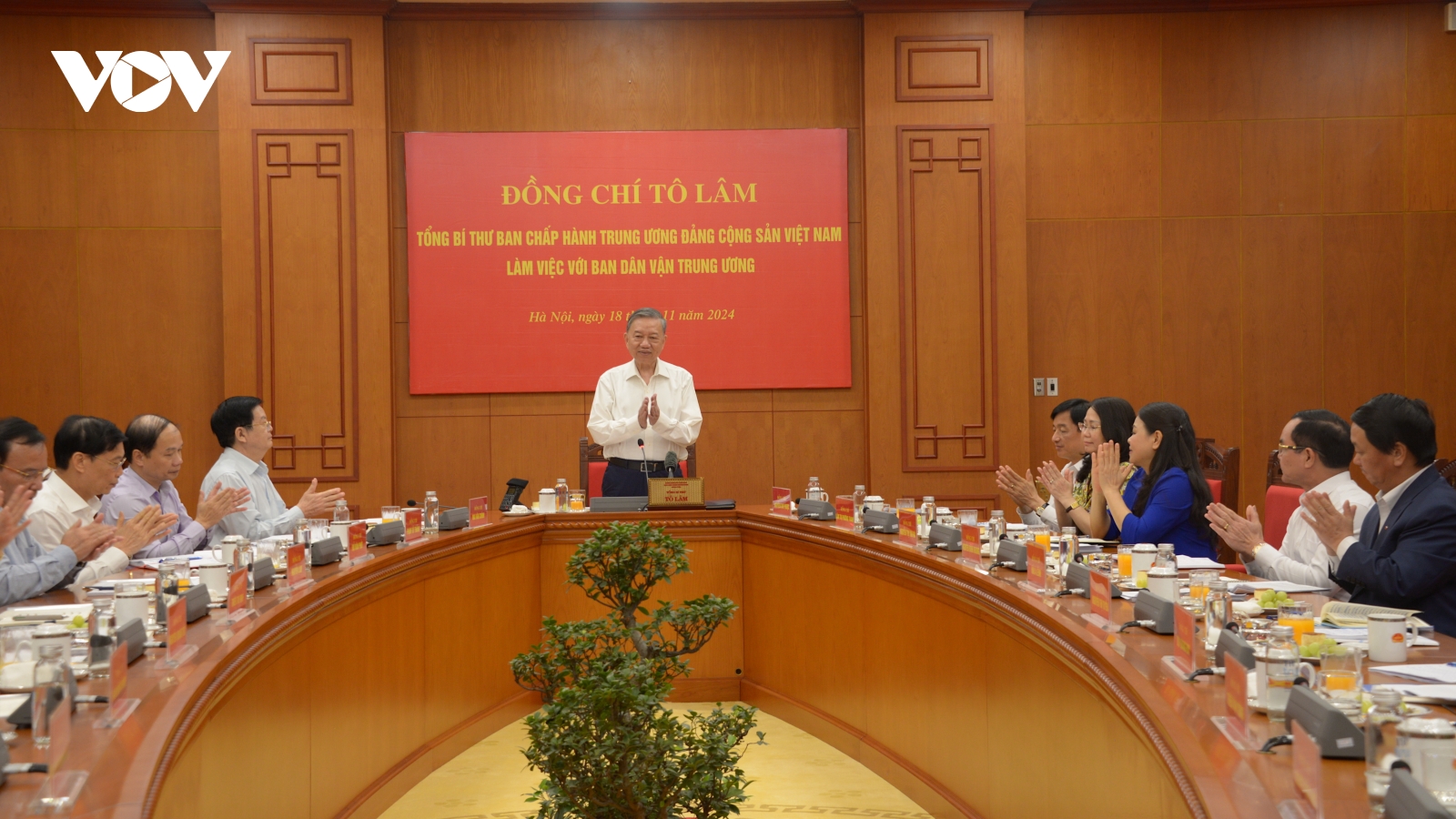 VOV.VN - Chiều nay (18/11), tại Trụ sở Trung ương Đảng, Tổng Bí thư Tô Lâm chủ trì buổi làm việc với Ban Dân vận Trung ương về tình hình thực hiện nhiệm vụ công tác dân vận từ đầu nhiệm kỳ Đại hội 13 của Đảng đến nay và nhiệm vụ trọng tâm từ nay đến Đại hội 14 của Đảng.