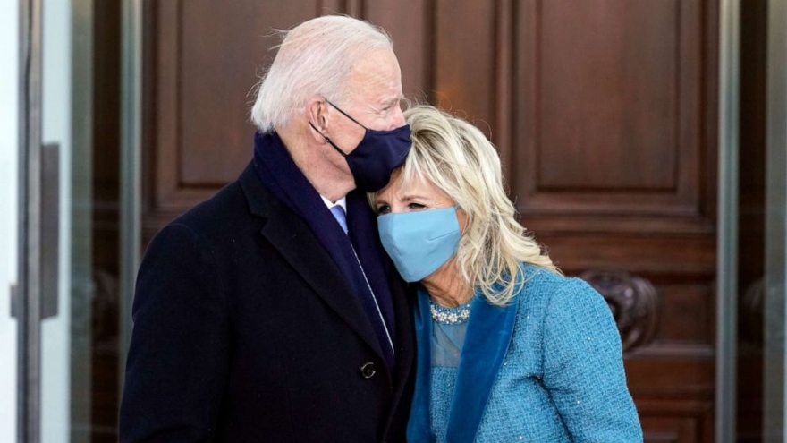 VOV.VN - Sau lễ tuyên thệ nhậm chức, Tổng thống Mỹ Joe Biden nắm tay đệ nhất phu nhân Jill Biden cùng những người thân trong gia đình ông bước chân vào Nhà Trắng, tất cả đều đeo khẩu trang.