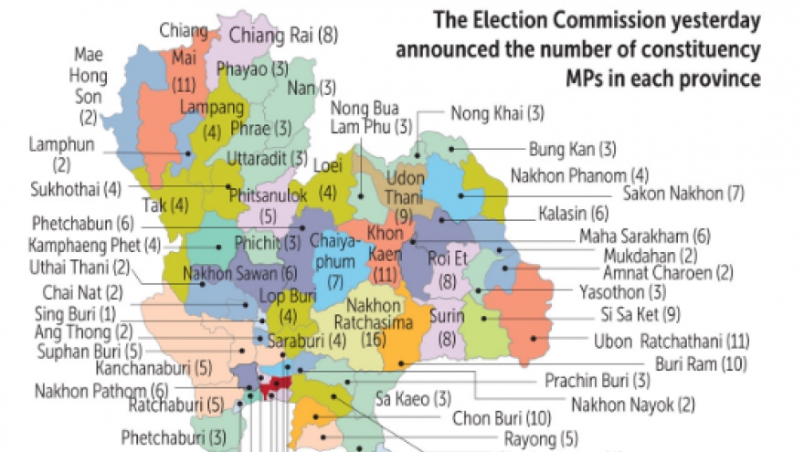 VOV.VN - Ủy ban Bầu cử quốc gia Thái Lan (EC) ngày 30/1 đã thông qua phân bổ ghế theo khu vực bầu cử của từng tỉnh, thành, đánh dấu một bước tiến quan trọng khác để tiến tới tổ chức Tổng tuyển cử trong nửa đầu năm 2023.