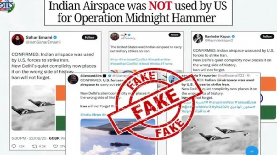 VOV.VN - Trước những đồn đoán lan truyền trên mạng xã hội về việc Mỹ sử dụng không phận Ấn Độ để thực hiện chiến dịch không kích Iran, Chính phủ Ấn Độ ngày hôm nay (23/6) đã lên tiếng bác bỏ thông tin này, khẳng định đó là tin giả và hoàn toàn sai sự thật.
