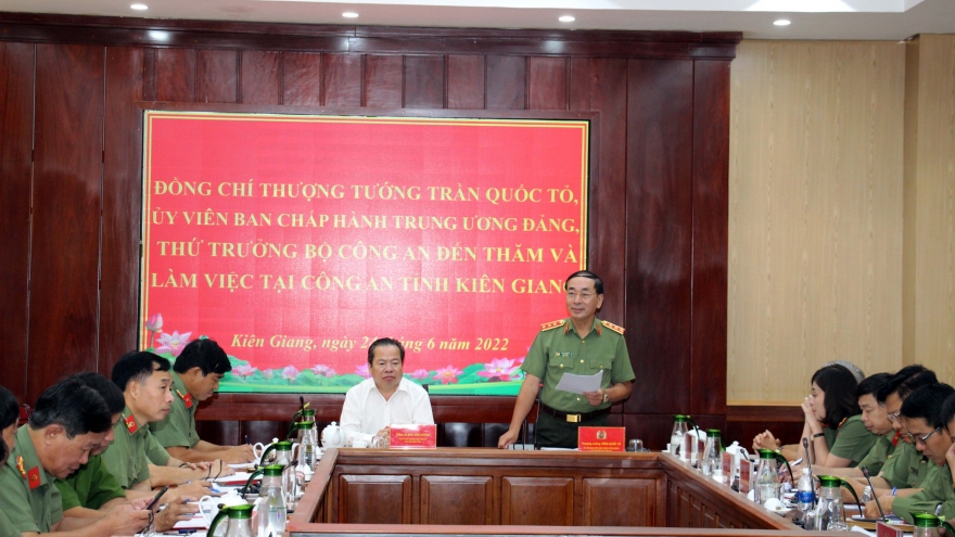 VOV.VN - Sáng nay (24/6), Thượng tướng Trần Quốc Tỏ, Ủy viên Trung ương Đảng, Thứ trưởng Bộ Công an cùng đoàn công tác đã đến làm việc với Công an tỉnh Kiên Giang. Cùng dự có ông Mai Văn Huỳnh, Phó bí thư Thường trực Tỉnh uỷ Kiên Giang.