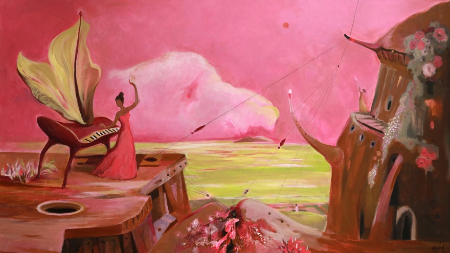 VOV.VN - Triển lãm Vũ trụ hứng phần 1 bao gồm 35 tác phẩm được Đào Anh Khánh vẽ acrylic trên vải, thể hiện khuynh hướng tư duy siêu thực. Hầu hết các tác phẩm được vẽ trong năm 2023, khoảng 5 tác phẩm vẽ từ 2-3 năm trước.