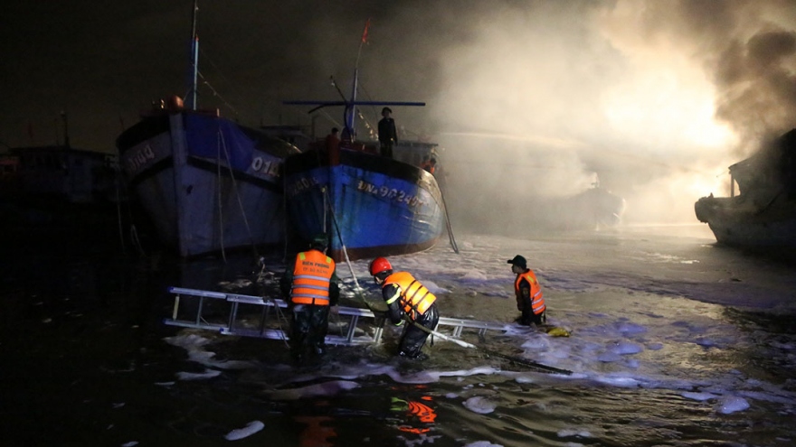 VOV.VN - Lúc 2 giờ sáng nay (7/1), Bộ đội Biên phòng thành phố Đà Nẵng phối hợp Cảnh sát phòng cháy chữa cháy và cứu nạn cứu hộ, Công an thành phố Đà Nẵng dập tắt vụ cháy 3 tàu cá, không để cháy lan sang các tàu cá bên cạnh.