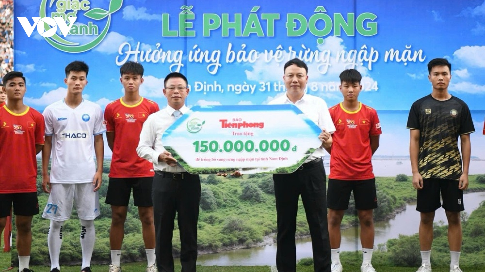 VOV.VN - Mới đây, trong khuôn khổ trận Siêu Cúp bóng đá Quốc gia 2023/2024 tổ chức tại sân Thiên Trường, Nam Định, Báo Tiền Phong phối hợp với Sở Nông nghiệp và Phát triển Nông thôn Nam Định tổ chức Lễ phát động trồng và bảo vệ rừng ngập mặn trên địa bàn tỉnh.